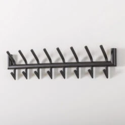 Kapstok Bello is erg populair dankzij zijn neutrale design met een stoere touch. Deze wandkapstok heeft een breedte van 78 cm en komt uit de collectie van het woonmerk Fraaai. Hij is voorzien van acht handige haken, welke elk twee ophangmogelijkheden hebben. Dit exemplaar is in zijn geheel uitgevoerd in stevig staal en heeft als afwerking een matte donkergrijze poedercoating gekregen. Dankzij de twee bevestigingspunten aan de achterzijde, kan deze kapstok gemakkelijk aan de wand gemonteerd worden. Bevestig kapstok Bello aan een wand in de hal, woonkeuken of slaapkamer en geniet van een opgeruimd interieur. Tevens verkrijgbaar in een variant met zes haken.